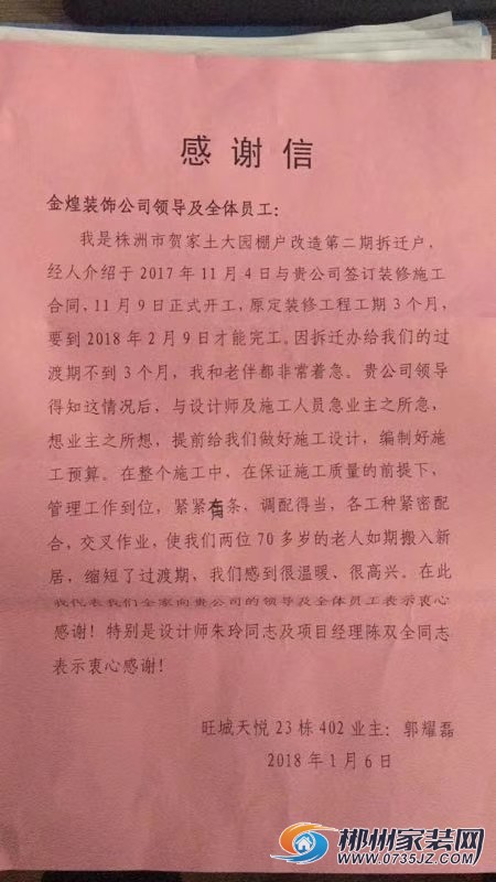 正所谓金杯银杯不如大家的口碑,装修公司也是一样,做的好不好,问下装过的业主就知道了;株洲金煌装饰1月6日又一次又到业主的感谢信及锦旗,一直以来业主的肯定是金煌人前进的动力,也是金煌人一直不遗余力在做的一件事!